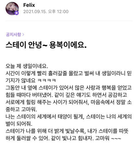 ‘나는 스테이의 세계에서 태양이 될께,스테이는 나의 세계의 별이 되어줘’..한글 배운지 얼마 안되었는데 감수성이랑 표현력 뭐야ㅠㅠㅠ용복아 행복해라ㅠㅠ
