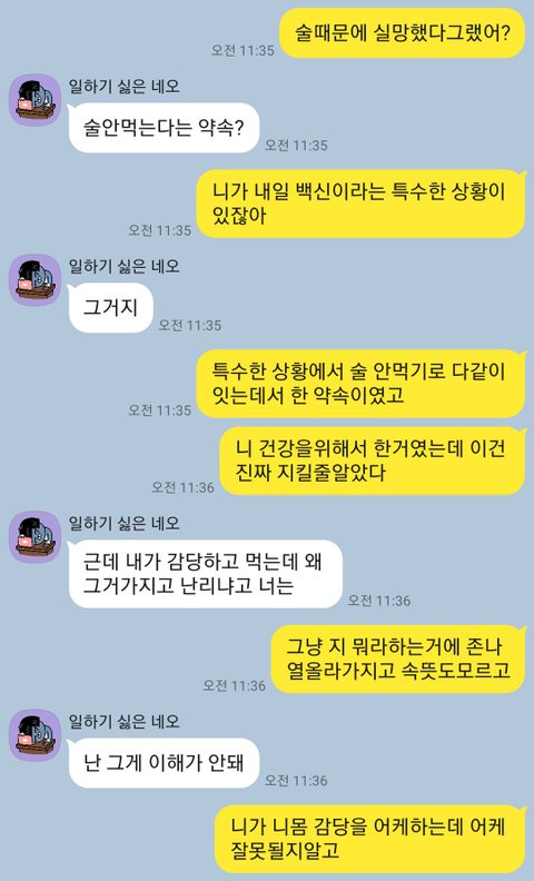 갈등이 커진것은 코로나 백신을 맞아야해서 앞뒤로 3일씩은 술을 안먹기로 약속을 했었는데 어기고 백신을 맞기로 한 전날 먹은 이유입니다.