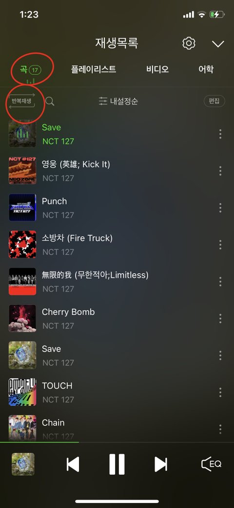 재생목록 다 비우고 17곡만