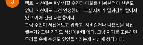 무리에서 떨어졌거나 무리에 남아 왕따였거나 현실적으로 그런얘가 어떻게 무리와 함께 2년간 괴롭혔느냐지 서신애말만 봐도 폭로자측 증언과 시기가 안맞는데 인터뷰에서 언급한 무리속 선배들과 수진의 2학년 동급생 무리가 팩트일 경우 신애의 입장문은 신빙성이 현저히 떨어지게됨