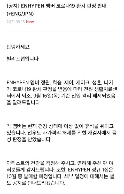엔하이픈 코로나 전원 완치