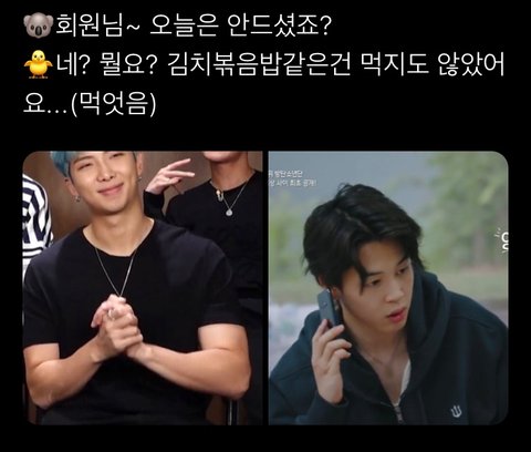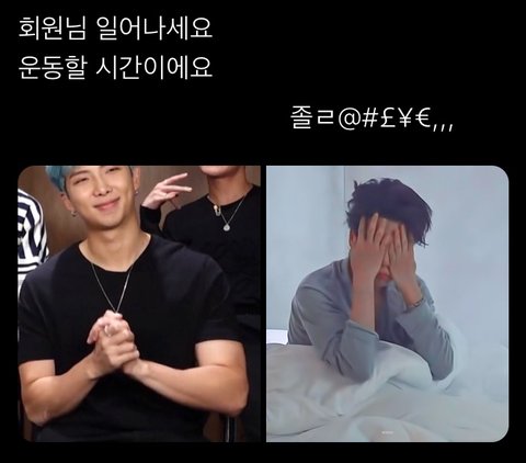 억지로 자고 있는 지민 회원님 끌고 pt 하러와서 혼자만 신나고 체력 넘치는 헬스트레이너 남준 같음 ㅋㅋㅋㅋ