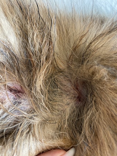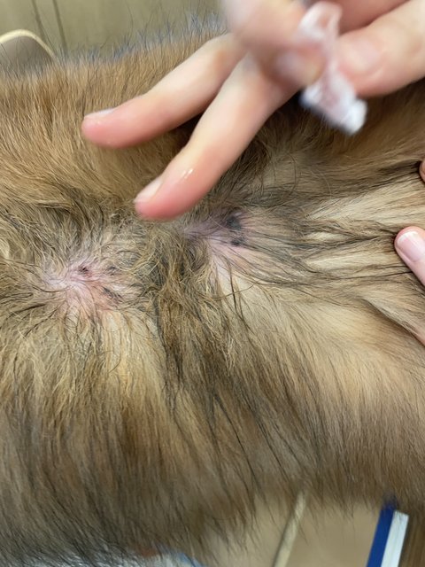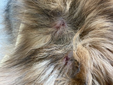 엉킨 털을 풀려고 거실로 나와서 보니 피딱지가 크게 두군데 균일한 간격으로 있었습니다.