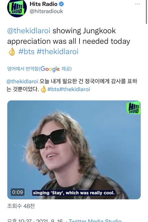 bts의 big fan이라고 함 그리고 정국이가 브이앱에서 부른 stay 봤고 멋있었다고 하고 감