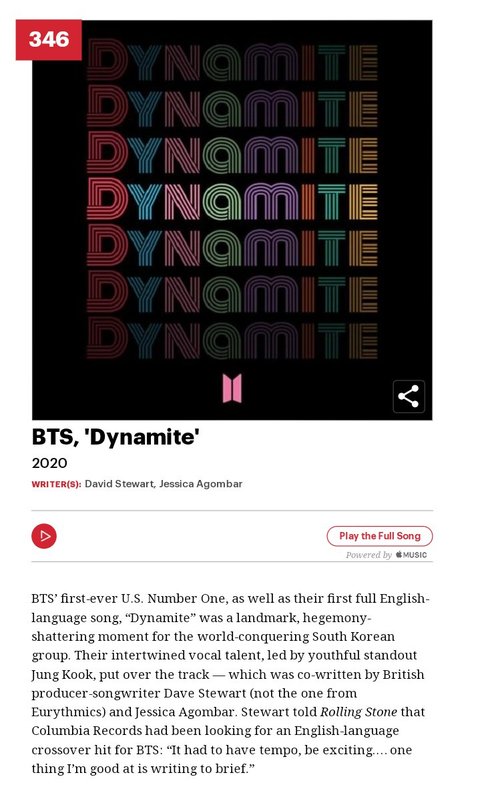 롤링스톤지 선정 올타임 가장 위대한 500곡 중에 한국인 최초 동양인 유일 방탄 다너마 선정됨