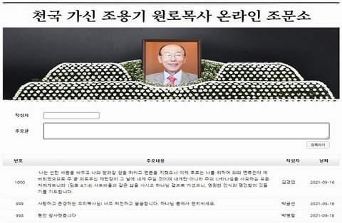온라인 조문소에는 16일 오후 3시 30분 기준 1,000개 이상의 추모글이 올라왔다. 조문객들은 한국교회의 큰 별인 '조용기 목사'의 별세를 안타까워하며 글로써 마음을 전했다.