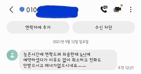 "늦은시간에 연락드려 죄송한데 4시에 예약하셨다가 이유도 없이 취소하고 전화도 안받으시고 매너가없으시네요ㅡㅡ"