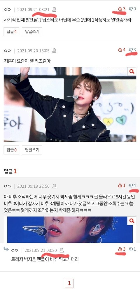 판 박지훈 글 집착에 돌아버린 정병련 다들 보고가ㅋㅋ 계속 이글 비추 조작질하다가 새벽 3시 20분에 들어와서 팬인척 장작댓 쓰고 비추조작한다는 댓도 비추박고 좋은댓에 비추박고 지글에 추천 3개씩 박아놓은거ㅋㅋ 얼마나 미쳐야 이틀 지난글에 이짓 할 수 있는거야? 더웃긴건 트레저 박지훈이랑 이간질까지ㅋㅋㅋ 아개웃겨ㅋㅋㅋㅋㅋ저 정병련 박지훈팬들이 이제 누군지 다아니까 꼴에 의심받기는 싫나봐ㅋㅋㅋ 추하다 정병아