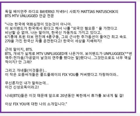 올해 방탄이 영국 언플러그드에 출연해서 콜드플레이의 'FIX YOU'를 커버함.