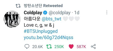 콜드플레이가 한글로 '아름다운' 트윗 그리고 방탄이 리트윗