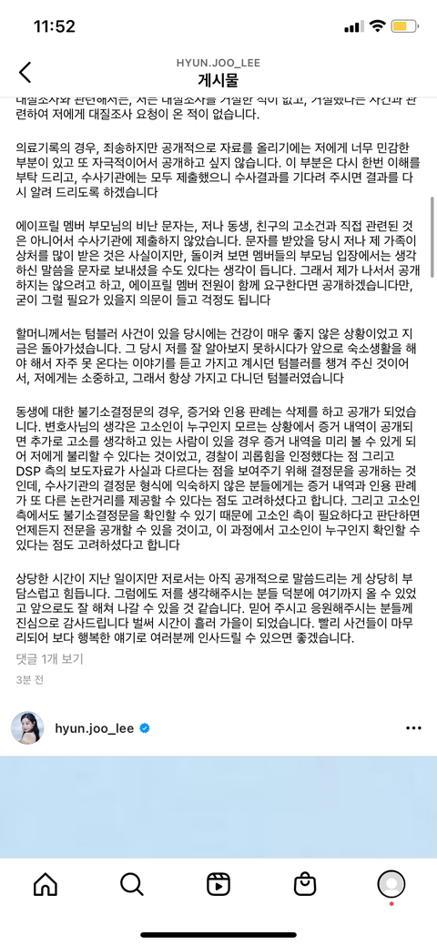 에이프릴측은 먼저 고소보다는 대화로 해결하려했는데 대형 로펌끼고 법의 심판을 바란건 현주측임. 근데 이번에 올린 해명문에서는 자신이 고소 많이 당해서 힘들다는 내용이 반이나 됨ㅋㅋㅋㅋㅋㅋ 정작 숙소생활 기간 차이, 신발 훔쳐 신었다는 것, 10만원 없어졌다고 멤버들 도둑취급했다, 리허설 펑크같은 부분들은 해명 없고 그나마 해명한 내용들 중에서 증거 제출할 수 있는 의료기록은 민감하다고 비난문자는 부모의 입장으로 생각해보니 이해가 된다며 증거 제출× 먼저 법정싸움 원한 쪽이 누군데 논리적이지 못하게 아직도 감정에 호소하네. 그럴듯하게 길게 써놨지만 결국 대질조사 요청 온 적 없다→사건 처진게 거의 7개월 전인데 아직도 요청이 없는지? 상식적으로 말도 안될 뿐더러 그러면 현주가 요청하면 되지 왜 7개월 동안이나 요청을 기다리고 있음? 의료기록은 자극적이고 민감해서 공개×→이미 자살시도라는 민감한 부분은 다 나왔는데 대체 뭐가 더 민감한 부분이 있다는거임? 비난문자는 지금 생각해보니 그럴 수 있다는 생각도 들었으니 공개 안할거고 그렇지만 멤버 전원이 원하면 공개할거임→그 문자를 에이프릴 부모님 일동이 보낸 것도 아니고 문자를 보냈다는 부모님은 공개를 원한다고 하시는데 왜 굳이 다같이 원해야 공개해야하는거? 텀블러는 오해의 소지가 있게 써놨다.정정하자면 그때는 살아계셨지만 많이 편찮으셨고 그래서 항상 지나고 다닐 정도로 소중했다→그렇게 소중한 텀블러가 몇 달 동은 없어졌고 심지어 상상치도 못한 곳도 아니라 냉장고 안에 있었다고 현주 친구가 말했는데 그렇게 대놓고 있는걸 왜 못찾았을까 불기소결정문은 고소인을 모르는 상태에서 증거를 공개하면 증거 내역이 미리 보여 자신에게 불리하여 가렸다. 많은 상황을 고려하여 올린 것→애초에 뭐가 그렇게 불리했길래 동생 이름은 실수로 못가렸지만 증거는 꼭꼭 가리고 올렸을까? 애초에 개인정보같은 공개할 없는 부분이여서 가린게 아닌 자신에게 불리해서 가린거라는걸 인정한 순간부터 이현주는 자기 잘못 인정한거임. 세상에 대중들에게 결정문을 공개하는데 스스로에게 불리한 부분은 가리고 에이프릴에세 불리한 부분만 올리는게 말이 됨? 그렇게 따지면 에이프릴도 심리기록지에서는 현주의 행동으로 인해 받은 피해만, 의료기록에서는 심각한 병명만 공개하지 자신이 이현주가 싫다는 말과 심각해보이지 않는 병명까지 전문 공개해 비난받을 여지 남겨둔 이유는 뭐냐. 게다가 이현주측은 '경찰이 괴롭힘을 인정했다는 점'이라고 썼는데 '디씨와 네이트판에 올라간 글에 의하면 이현주가 따돌림을 당했다는 것은 공공연한 사실' 이라는 말과 그냥 따돌림은 공공연한 사실이라는 말이 같나? 네이트랑 디씨에서 에이프릴 억까글들을 증거로 제출했으면 그 억까글들로 보아 이현주가 따돌림 당한건 공공연한 사실이라는 것인데 이걸 같다고 생각한거면 독해력에 문재있는거고 둘이 다른걸 알면서도 이번 해명문에도 경찰이 괴롭힘을 인정했다고 쓴거면 조카 뻔뻔한거지.