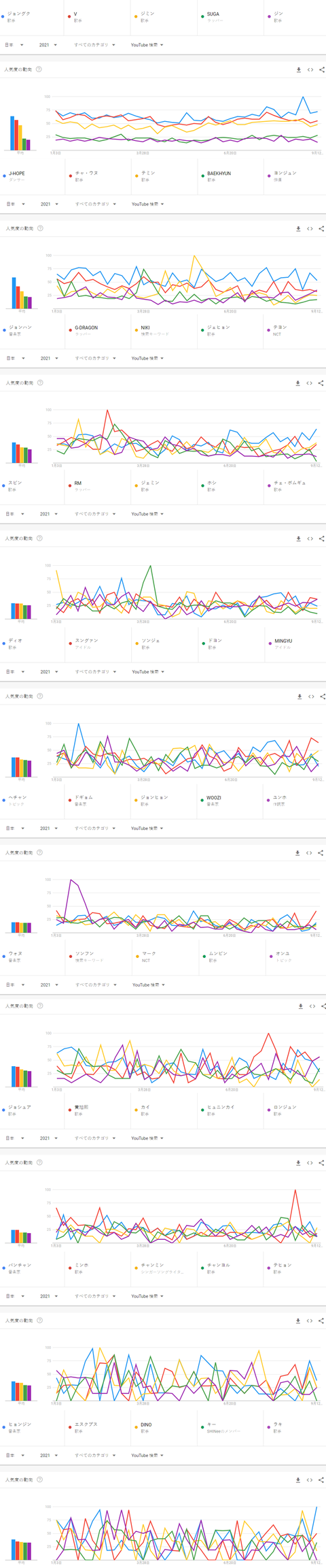 2021년 일본 유튜브에서 가장 많이 검색된 한국 남자아이돌 멤버 TOP50