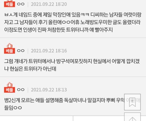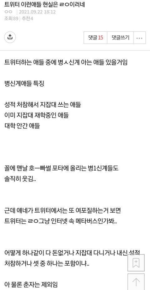 ㅇㅇ특징은 1.나이대는 10대후반~20대초중반 2.이기야노체 쓰고 엄마는 애미,아빠는 애비라고 부름 3.한남 싫다면서 맨날 남자얘기함 4.남돌팬들한테 이유없이 시비걸고 키배뜨는걸 즐김 5.미자애들은 술담배전시 ㅈㄴ하고 성적은 대부분 개바닥임 6.정신병약 복용하는걸 자랑하듯이 올림 패션정병도 개많음 7.셀털 즐겨서 자기사진 개많이올림 예쁜애 못봤는데 지들끼리는 갓꾸 ㄷㄷ 이럼 ㅋㅋ 8.대부분 가정 불우하거나 고등학교 자퇴생/지잡대생인데 인터넷에서는 사이버여포마냥 굴고 추종해주는 시녀들도 많음 9.명문대생에 발작하는 트윗 올리는애들 꼭 있음 10.지들은 byungshin계가 아니라면서 은근 그렇게 불리길 바람