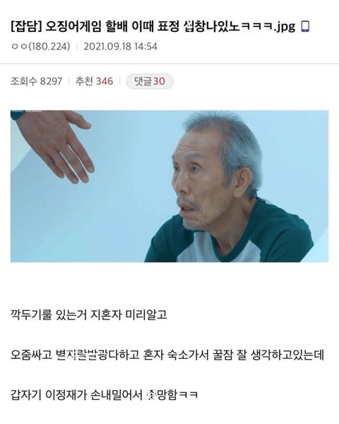구슬게임할때 치매연기한거는 아는데 오줌싼것도 일부러한거?? +댓글에 스포가있으니까 아직 다 안본사람들은 댓글 안보기를 추천한다... 난 아직 다 안봤는데 여기 댓글에 스포있는걸 봐버려서 오겜 탈주할거임ㅅㅂ