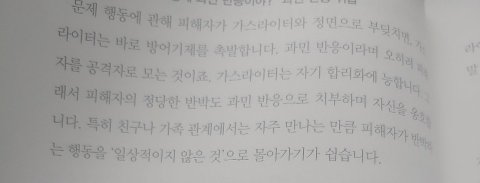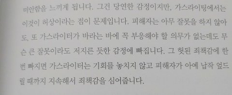 제가 요즘 가스라이팅 책을 보고 있는데 그게 큰 일로만 적용될 게 아니라 생각보다 많은 일상생활 속 소소한 상황에서 일어나는 일이더군요. 그 사례 중에 예를 들면 연인사이 바람피운 쪽에 그걸 추궁하면 오히려 실수한 쪽이 나를 의심하느냐며 과실을 지적한 상대에게 너무 과하게 화를 내서 결국 잘못을 지적한 쪽이 오히려 사과를 하게 만드는 것도 가스라이팅이라 하더군요. 가스라이팅이란 게 비단 연인 사이에서만 해당되는 게 아니라 가족관계에서도 충분히 일어나는 일이라고 해서. 제 경우엔 처음엔 상대가 실수해서 그걸 지적했는데 그 상대가 과하게 화내버리는 바람에 정작 자신이 사과하는 경우 또는 죄인 만들어버리는 경우인데 (엄마는 언니의 그런 반응에 번번이 나를 탓하게 되니 제가 잘못한 것도 아닌데 잘못한 상황으로 늘 몰아져서) 제가 언니한테 당하는 게 딱 그거 같아 생각이 났습니다.