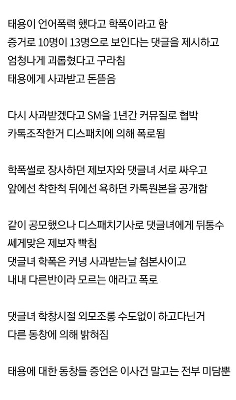 현실은 학창시절 동창증언들은 온통 미담뿐이었는데 누명쓸때도 태용 억울하다고 글써준 동창들 밖에 없던데 어쩌냐 ? ㅋㅋㅋㅋ