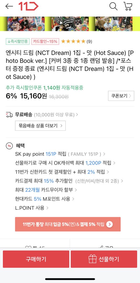 저번에 다른 준표가 한번 설명해준적 잇긴한데 11번가 '선물하기' 쿠폰이 있어 이거 중폭할인 돼서 2000원 더 싸져!