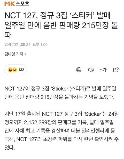NCT 127 정규 3집 '스티커' 음반 판매량 215만장 돌파