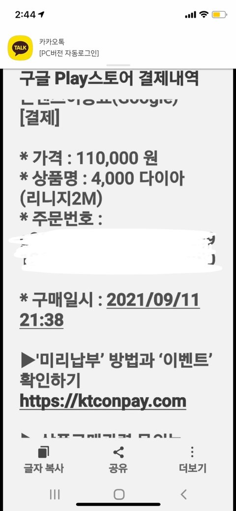 구글 플레이 스토어 '리니지2M'이라는 게임에서 4,000다이아를 구매했다는 내용과110,000원이 결제 되었다구요