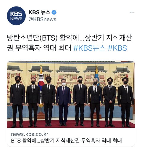 방탄소년단 활약으로 상반기 무역흑자 역대 최대라길래 찾아봤는데 8억5천만 달러랜다.. 8억 달러가 9400억이라는데 진짜 미친거 아닐까,, 문화의 힘이 대단하다