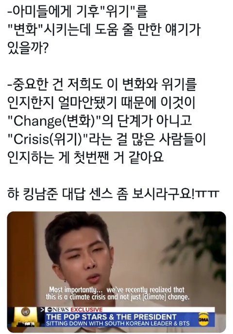 내가 이 질문을 받았더라면 기후위기에 영향끼치는 여러 요인들 생각나는대로 말하고 이래야한다 저래야한다 요구성? 그런 뻔한 대답을 땀 뻘뻘 흘리며 말했을것 같은데ㅠㅋㅋ
