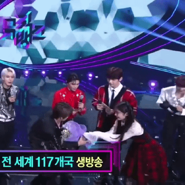 127 1등해서 꽃다발 건내주는데 아린 옷에 걸림 저 넷이서 우왕좌왕하다가 떼졌는데 나유타가 나즈막히 스티커입니다. (참고로 엔시티127 활동곡이 스티커)