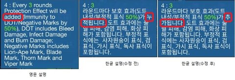 위 사진에서 보시듯이 이 보호 효과의 한글 번역이 원래는 '3라운드마다 보호 효과(도트 내성/부정적 표식 50%)가 누적됩니다'라고 돼 있었습니다.