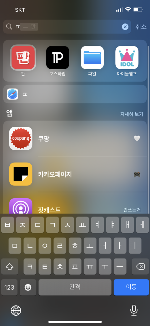 잠금상태에서 왼쪽으로 스윽해서 뭐 뜨잖아 거기서 검색하는 데다가 ㅍ 검색하면 ㅍ앱뜸 판이랑 포타도 떠 잠금상태인데도 뜨거든 이거 어케해야 안보이지