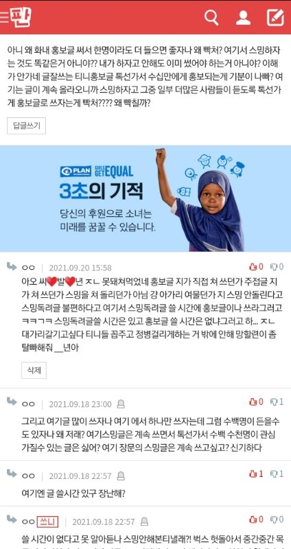 (그 스밍독려글 썼던 티니는 홍보글 쓰겠다고 한적도 없는데 빨리 쓰라고 어디까지 썼냐고 명령질하고 다른티니가 자기가 홍보글 써오겠다니까 엔터에 바로 올리지 말고 팬톡에 쓴거 먼저 올리래 그거 복붙해서 자기가 엔터에 글 올리겠다고ㅋㅋㅋㅋ ㅈㄴ 어이털림 왜 남이쓴걸 빼앗으려는건지) = 티니들 스밍 너무 안돌리고있다고 스밍돌렸음 좋겠다는 글에다가 앨범많이사는 티니 왜 욕하냐고 (??그 누구도 욕한적없음) 묻는 애
