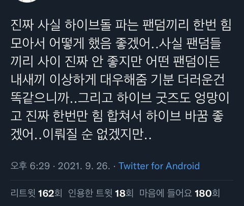 나는 하이브 말고 위버스샵 좀 어케 해줬으면 트레카 중복╋하자 존많╋교환 ㅈㄴ 오래 걸리는데 교환해도 하자있는거 올때도 있고 그리고 굿즈에 포카 끼팔 그만 굿즈 가격을 내리던가ㅠ 초상 없는 굿즈들 진짜 터무니 없는 가격 너무 많음