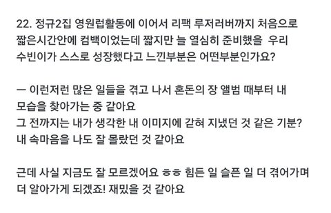 사실은지금진짜나를찾아가는중이라고 몰래얘기해줄때마다 시간이무지소중하게느껴지지않니 언젠가는오늘을떠올리면서그때어렸지하고웃을날이슬프지만헤프게기대돼 나도나를아직잘모르겠어수빈아 언제예고없이알아버릴까두렵기도해 그래두너랑같이어른이된다는약속은견디기좋아