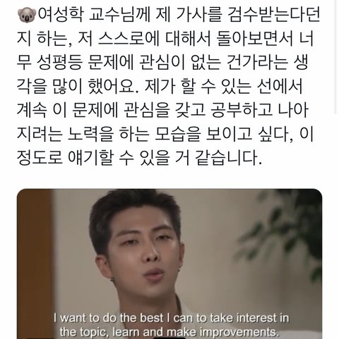난 여기서 남준이가 그 당시 논란이 된 곡을 쓴 다른 작곡가나 아티스트와 다르다고 생각하는 점은 자신의 잘못을 인정하고 사과하고 더 나아가 성평등 문제에 관하여 더 배우겠다는 자세인거 같아