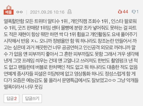 ㅊㅂ용) 뭐가 까이냐는 애들아 신고로 삭제당하고 삭튀하는거지 요즘 엔터에 맨날 도배했다 사라짐 한번 나타나면 기본 세시간 도배던데 뷔까는제목으로 재현까기도 하고 그냥 무작정 까는거 도배하기도 함 전혀 상관없는 아이돌 댓글에도 자기가 쓴 ㅇㄴㅇ 댓글 빌런으로 재현까댓 루머 달고다니고 ㅇㄴㅇ 빌런=털주작빌런임 이글은 어제 몇시간동안 까이는데 엔시티는 웃기게 까인다고 ㅈㄹ해서 올라온글