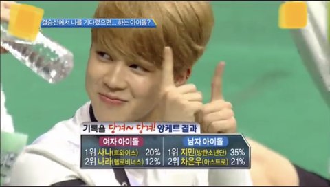 유튜브에 아육대 스텝이 이거 관련 말한 영상있는데 여돌들한테 후보도 안주고 보내달라고했는데 1위 지민이가 된거래 그게 더 미침ㅋㅋㅋ 객관식아니고 주관식인데 1위지민ㅋ옆에 정구기가 더 신나하는거 넘 ㄱㅇㅇ ㅠㅠ