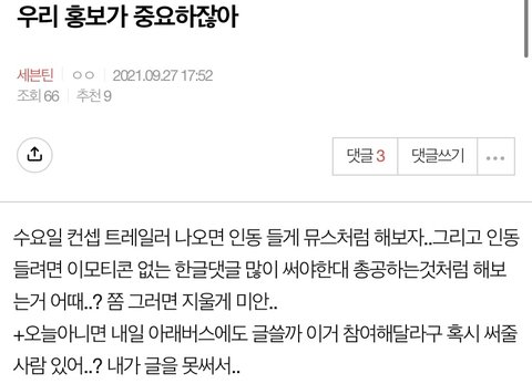 아까 이 얘기 나와서 그런데 혹시 이거에 대한 의견 남겨줘!! 아무래도 인동에 올라가면 사람들이 더 관심가지지 않을까?? 그리고 이미 외럿분들은 컨트도 스밍한다 들어서 우리도 이번에 같이하자!!