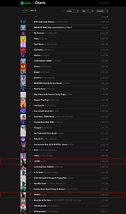 현재 리사 스포티파이 글로벌 음원 순위