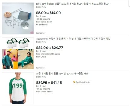 실제 오징어 게임은 작품의 '신선도'를 평가하는 미국 비평사이트 로튼토마토닷컴에서 100%를 받았다. 현재 트위터 등 글로벌 SNS에선 오징어 게임에 나온 게임들이 밈(Meme·인터넷에서 유행하는 이미지)이 돼 각종 패러디를 낳고 있다. 글로벌 온라인 쇼핑몰 이베이에선 오징어 게임에서 나온 생존 게임인 달고나를 만들어볼 수 있는 키트가 판매되고 있다. 핼러윈 데이를 앞둔 미국에서는 오징어 게임에 나온 의상도 인기다.