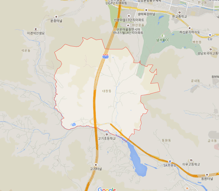 대장동은 지금 뿔 즉 고추를 박고선 빼도 박도 못하하는 그런 형국의 말하자면 양이든가 개든가 그런 상태 분당구는 확실하게 개 두마리가 붙어 있는 모습이고 이제 차츰 성남시 행정구역서 부텀 분당구 대장동 행정 구역을 보여 드리겠읍니다