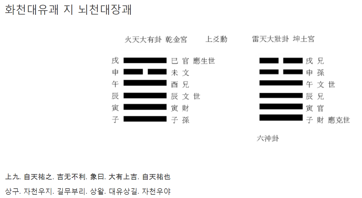 대유괘는 관성(官性)귀졸(鬼卒)이 원진(元嗔) 술자(戌字) 인성(印性)에 설기(泄氣) 당하는 모습 벼슬 감투가 기운이 빠질 내기고 관귀(官鬼) 병(病)이 동(動)을 하는 것이라선 좋을 것이 뭐야 원진(元嗔) 인성(印性)을 생조(生助)하는 격이니 건강 수명(壽命)을 위협 하려 든다는 거다 영양가가 결국은 없어질 거란거다 관귀(官鬼)없이는 일을 성취하지 못한다고 관귀가 동을 하여선 일을 성취시키는 것이 원진 협오스럽기만 하다는 것 관귀 일의 기운을 설기 하여선 붕괴시켜선 비겁(比劫)을 도우려 하는 행태를 그린다는 것 그러니 직장 터전 재물인들 비겁을 날뛰게 하려는 것인지라 바르겠느냐 인성(印性) 도장(圖章) 인장(印章)이 잘못 되는 것을 말하는 거다 관(官)의 직인(職印)이 잘못 움직이는 걸 말하는것
