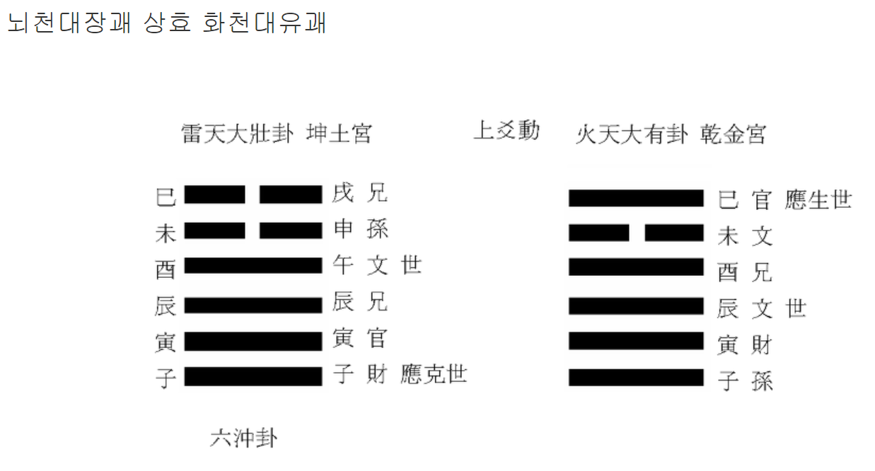 대유괘는 금궁(金宮)괘(卦) 세(世)팔세(八世) 삼효(三爻)이고 대장괘(大壯卦)는 토궁(土宮)으로서 세(世) 사효(四爻)에 있는 거다