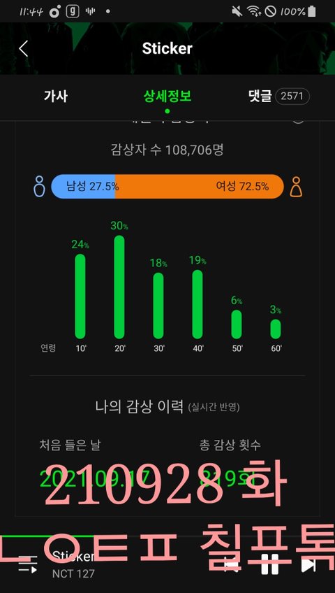 근 몇시간만이라도 스밍인증샷 올리고 글 쓰자! 양보다 질이지 리젠 빠른 게 중요한 게 아녀.. 시간이랑 횟수랑 재생바 보이게 캡처하고 워터마크까지! 우리칠 짱리칠 이번주 음방도 파이팅~~~