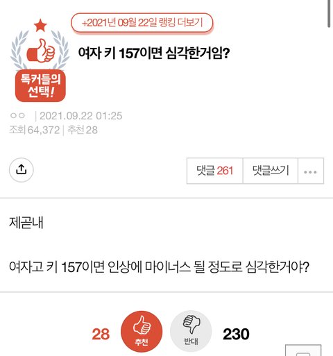 너 이 글쓴이지? 157 여자랑 원수졌냐? 솔직히 현실에서 157이건 얼마건 키 때문에 연애 못 하고 결혼 못 하는 사람 본 적 있어?ㅋㅋㅋ 키 작은 사람이 연애를 못 한다면 장담하건데 그건 키 때문이 아닐거다