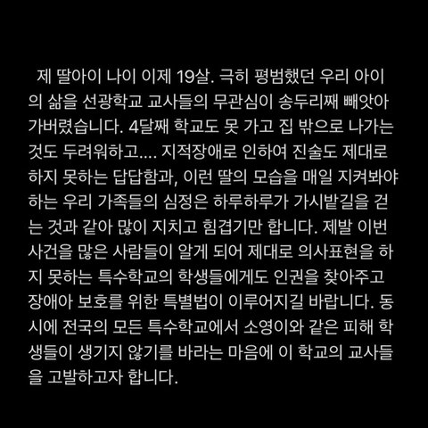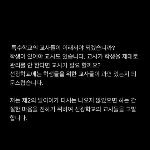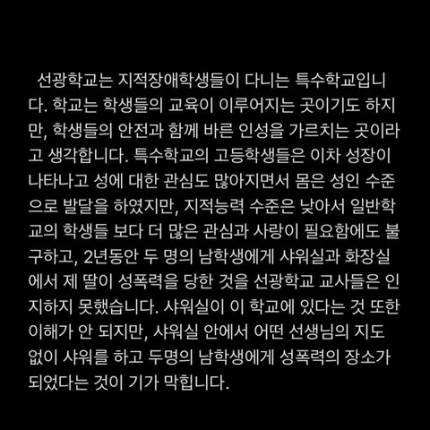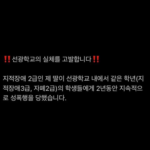 저는 그 일이 일어나고 난 후 거의 매일 학교를 가기 싫어하는 동생과 함께 집에 있었습니다. 동생이 불쑥 성폭행을 당했던 날의 이야기를 할 때면 차마 들을 수가 없어 처음에는 괜찮다고 동생을 진정만 시켰습니다. 하지만 동생의 이야기를 들을 수록 화가 나서 견딜 수가 없었습니다. 동생의 끔찍한 이야기와 이야기를 하는 동생의 표정과 행동 그리고 학교에서 본 선광학교 교사들의 태도가 동시에 생각이 나면서 괴로웠습니다. 그저 저에게 이야기를 해주는 동생에게 너무 고맙고 미안한 마음 뿐이었습니다. 동생을 달래서 진술을 받을 때면 동생은 식은땀이 나고 두 손이 차가워졌습니다. 결국에 동생이 참지 못하고 다른 이야기를 할 때면 아무 잘못도 없는 동생에게 괜히 화가 나기도 했습니다. 도대체 제 동생이 이런 일을 당할 때 무능력한 선광학교 교사들은 무엇을 했을까요. 초등학교때부터 거의 10년을 보낸 학교인데 그 전에 다른 일들은 없었을까 또 다른 걱정들이 밀려옵니다. 물론 제 동생을 따뜻하게 돌봐 주시고 가르쳐 주신 선생님들도 계셨습니다. 하지만 지금은 좋은 일들은 전혀 기억이 안 날 정도로 화가 납니다. 이제는 제발 가해학생들이 제대로 된 처벌을 받고 교단에는 학생들을 생각하는 진정한 선생님들이 있으셨으면 합니다. 특수학교에 대한 특별법이든 CCTV든 더 이상 제 동생과 같은 피해자가 생기지 않도록 도와주세요. 많은 사람들이 관심을 가질 수 있게 공유부탁드립니다.