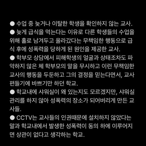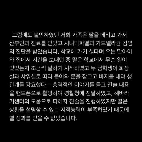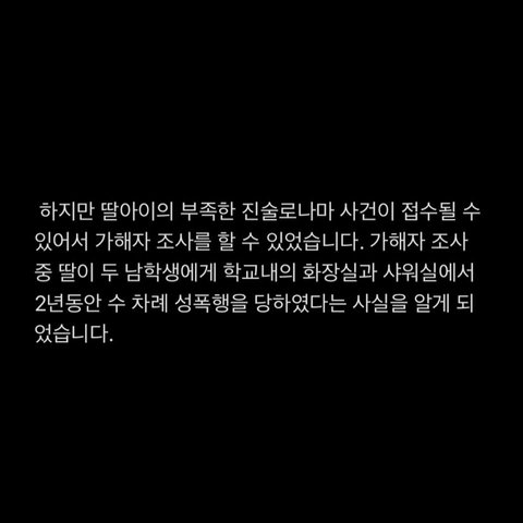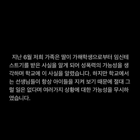 인스타그램에서 얼마전에 동생이 임신테스트기를 친구에게 받아왔지만 학교측에서 제대로 된 대처를 하지 않는다고 알려드렸고(아래 링크있어요) 경찰 수사 중 가해학생이 성폭력을 인정하여 다시 글을 올리게 되었습니다.(더 많은 분들이 관심을 가지셨으면 해서 판에도 올려요!)