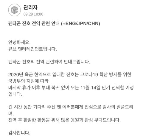 대충 9월 초에 미복귀 전역한거 아니냐는 소식이 들리긴 했는데 오피셜이 딱 올라와버림 ㅜㅜㅜ