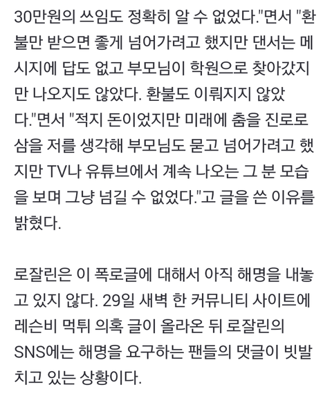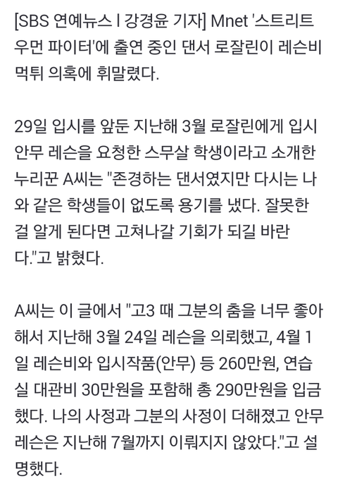 스우파 로잘린, 레슨비 먹튀 의혹...해명요구 빗발