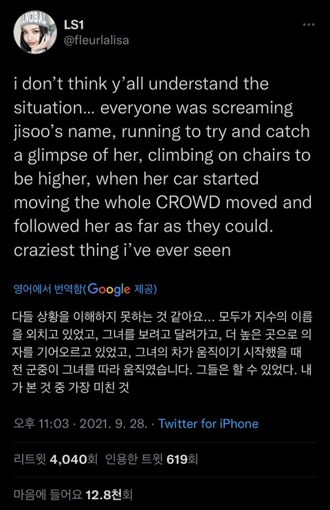 패션쇼 장소 앞에서 지수를 외치는 팬들 : https://twitter.com/lichaeinparis/status/1442849692954529798?s=21