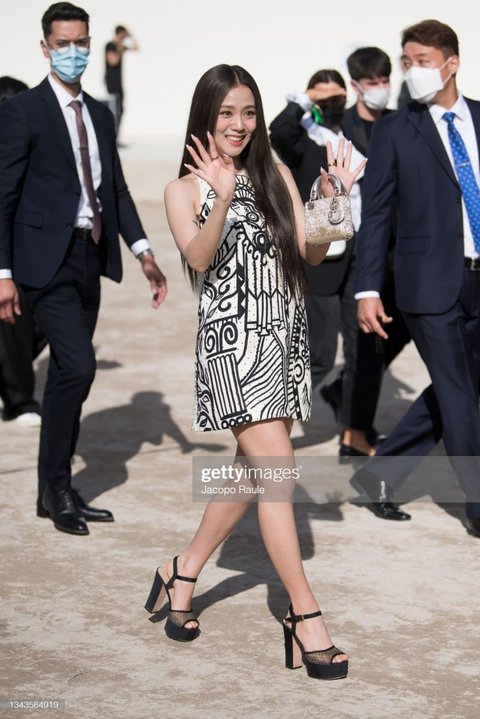 마무리는 바로 앞에 차가 있지만 더 나와서 팬들에게 인사해주는 지수와 게티 이미지의 무보정 지수