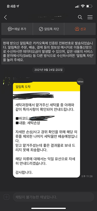 그리고 옷이 수거 된 다음 날 옷 하나가 손상되었다고 카톡 알림이 왔습니다...