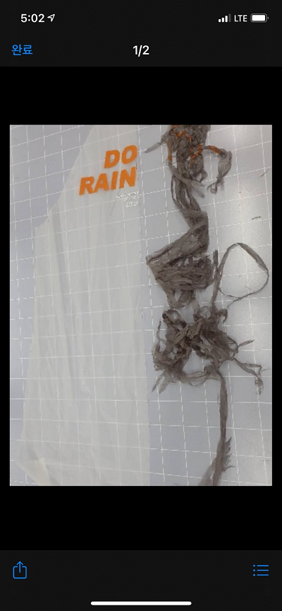 친구들한테 보여주니까 두번째 사진 우측에 저 끈이 뭐냐고 물어보던데 끈이 아니고 좌측에 있는 저 투명 원단이랑 같은 건데 저렇게 분쇄 된겁니다 ㅜㅜ